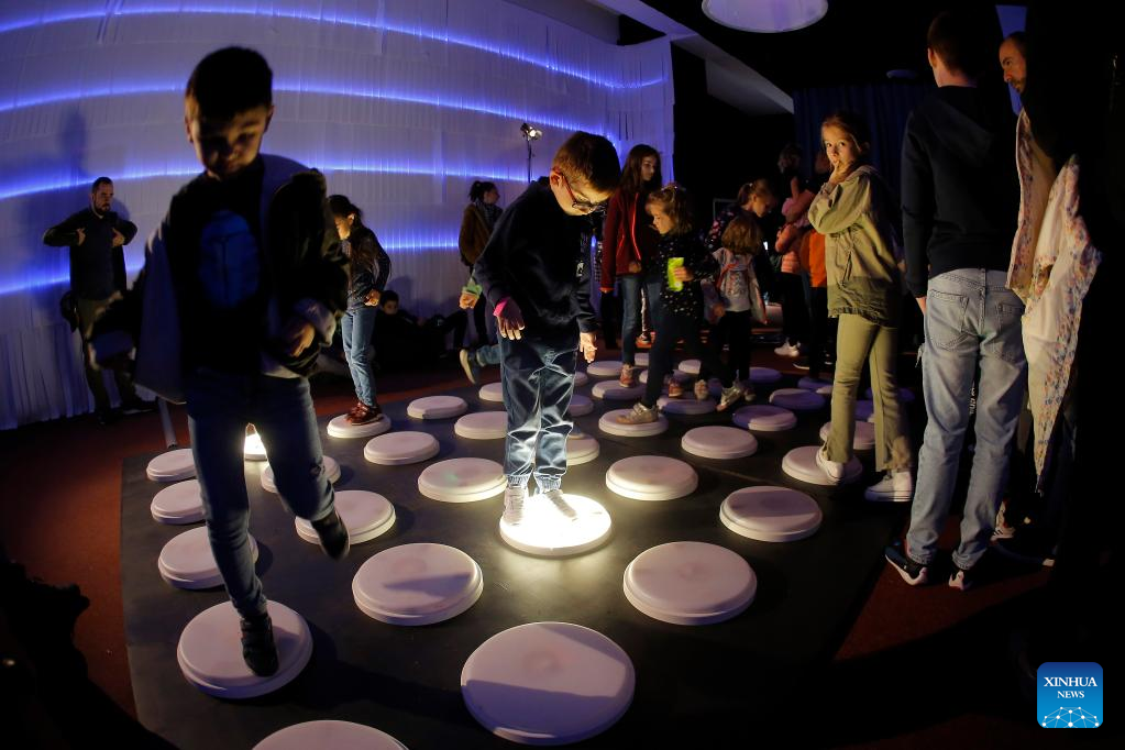 Children jump over a light installation while visiting the 3rd edition of the new media art festival RADAR in Bucharest, capital of Romania, Oct. 16, 2022. (Photo by Cristian Cristel/Xinhua)