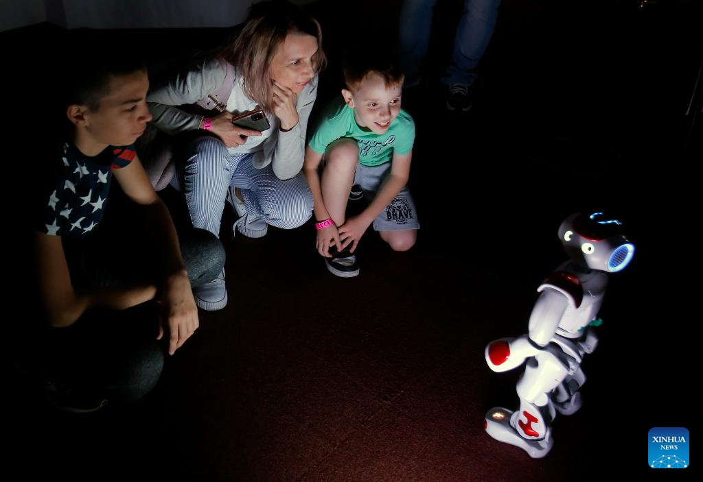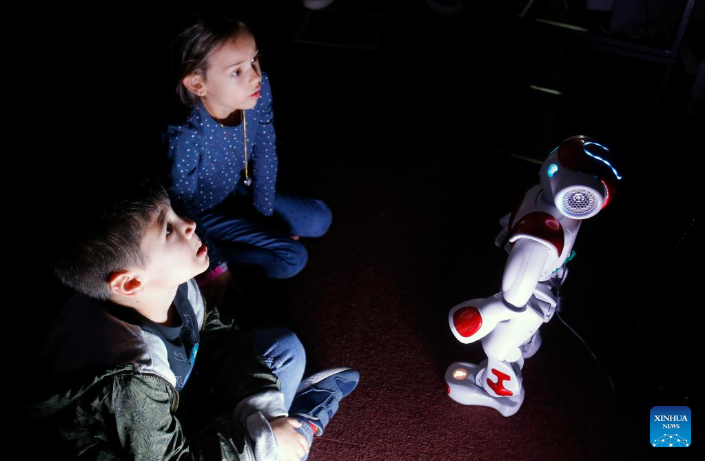Children interact with a small intelligent robot while visiting the 3rd edition of the new media art festival RADAR in Bucharest, capital of Romania, Oct. 16, 2022. (Photo by Cristian Cristel/Xinhua)