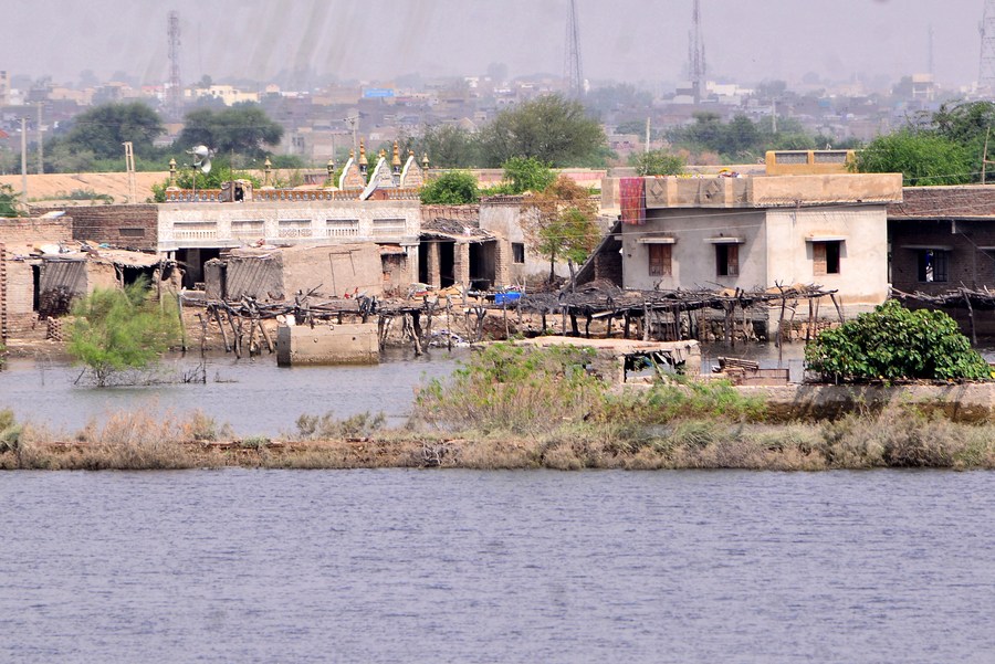 A flooded area is seen in Jamshoro district, Sindh province, Pakistan, Sept. 18, 2022. (Str/Xinhua)