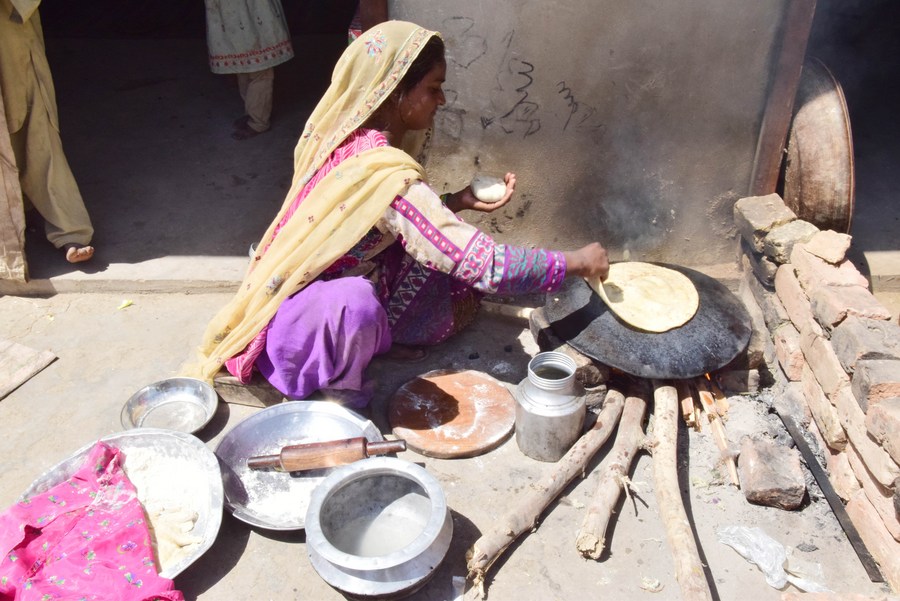 A flood-affected woman cooks on the outskirts of southwest Pakistan's Quetta on Sept. 16, 2022. (Photo by Asad/Xinhua)