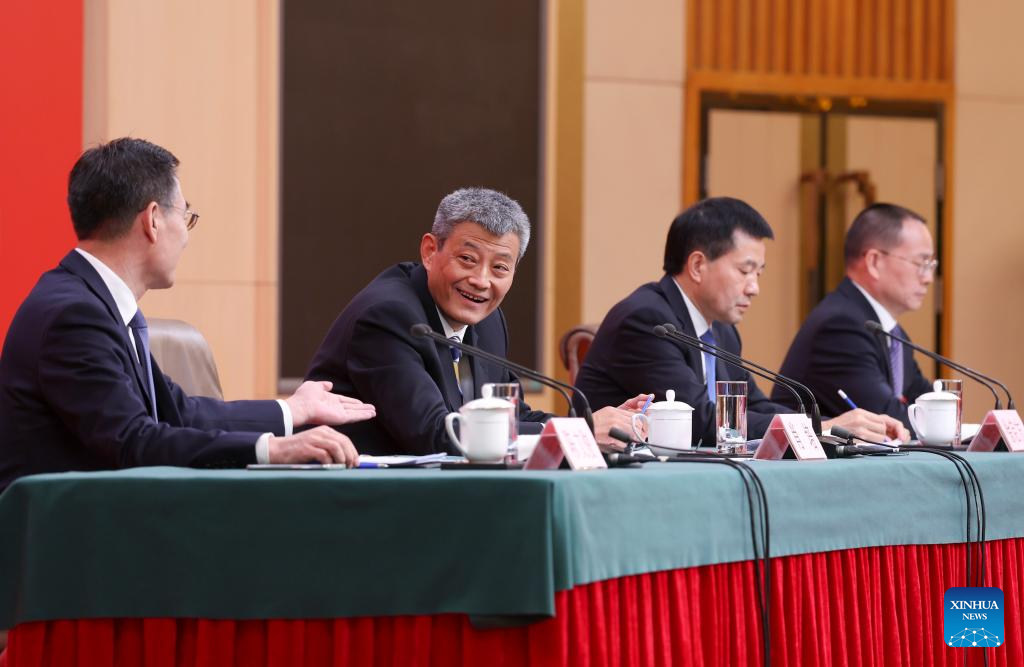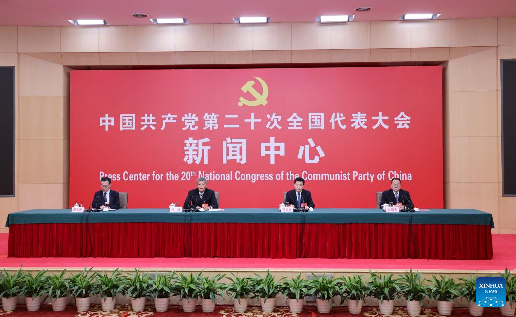 Xiao Pei, deputy head of the Central Commission for Discipline Inspection of the Communist Party of China (CPC) and deputy head of the National Supervisory Commission, Xu Qifang, deputy head of the Organization Department of the CPC Central Committee, and Tian Peiyan, deputy head of the Policy Research Office of the CPC Central Committee, attend a press conference on the sidelines of the ongoing 20th CPC National Congress in Beijing, capital of China, Oct. 17, 2022. (Xinhua/Zhang Yuwei)
