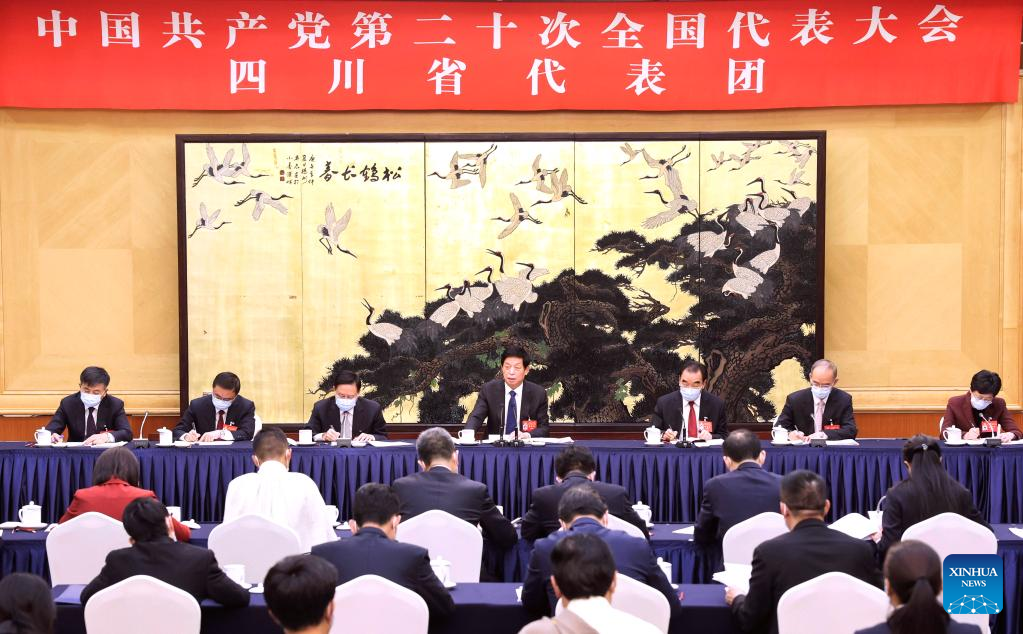 Li Zhanshu participates in a group discussion with delegates from southwest China's Sichuan Province who are attending the 20th National Congress of the Communist Party of China (CPC) in Beijing, Oct. 17, 2022. (Xinhua/Pang Xinglei)