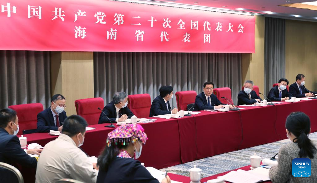 Han Zheng joins a group discussion with delegates from south China's Hainan Province who are attending the 20th National Congress of the Communist Party of China (CPC) in Beijing, Oct. 17, 2022. (Xinhua/Yao Dawei)
