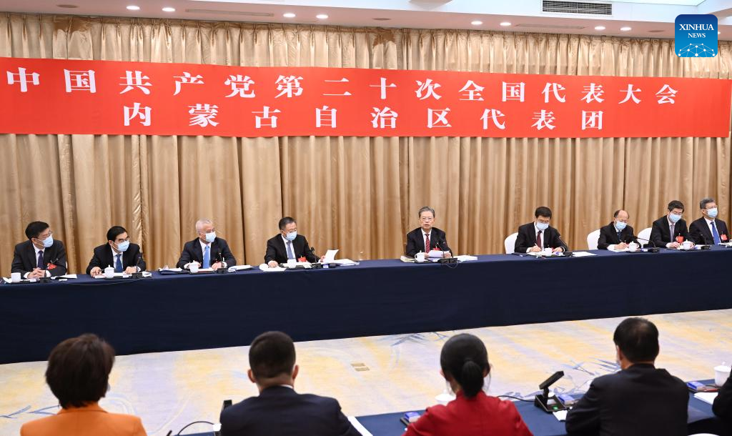 Zhao Leji joins a group discussion with delegates from north China's Inner Mongolia Autonomous Region who are attending the 20th National Congress of the Communist Party of China (CPC) in Beijing, Oct. 17, 2022. (Xinhua/Zhang Ling)