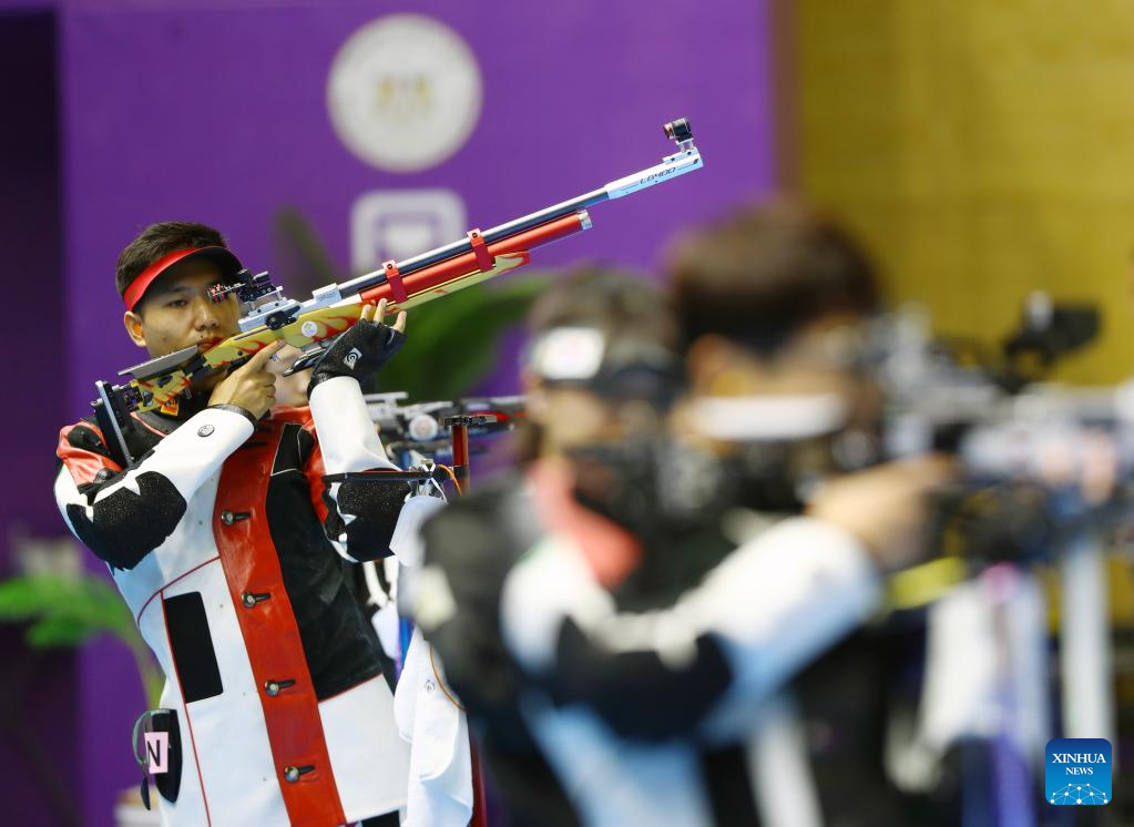 Yang Haoran (1st L) of China competes during the 10m air rifle mixed team gold medal match between China and South Korea at the ISSF World Championship Rifle/Pistol in Cairo, Egypt, Oct. 17, 2022. (Xinhua/Ahmed Gomaa)