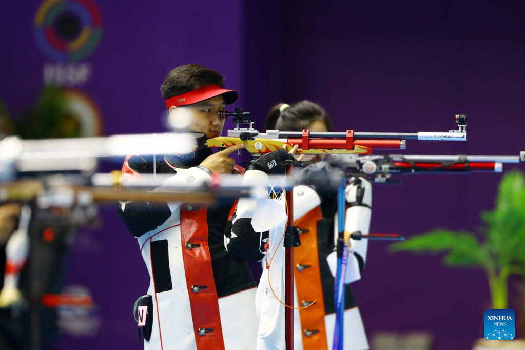 Huang Yuting/Yang Haoran (L) of China compete during the 10m air rifle mixed team gold medal match between China and South Korea at the ISSF World Championship Rifle/Pistol in Cairo, Egypt, Oct. 17, 2022. (Xinhua/Ahmed Gomaa)