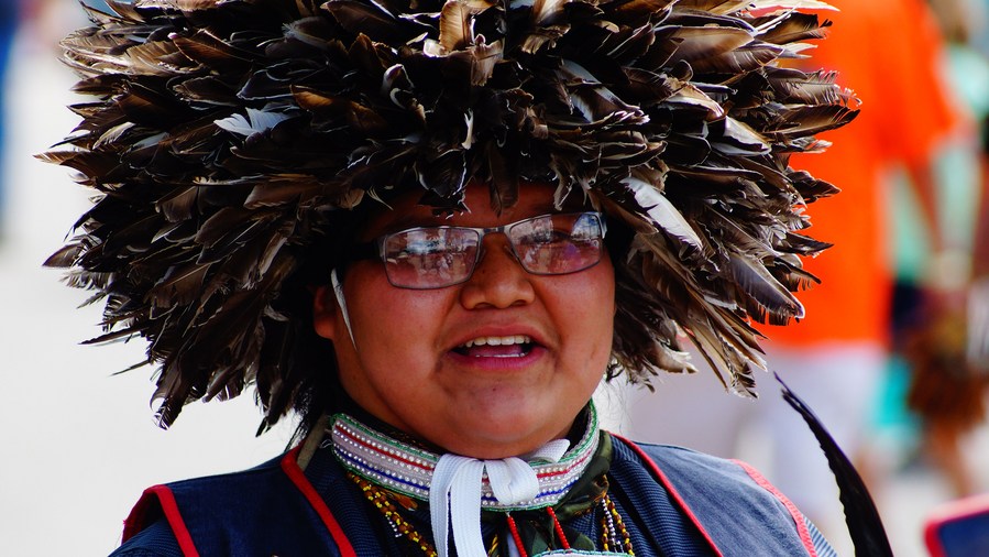 A participant is seen at the annual Gathering of Nations Powwow and Miss Indian World Pageant in Albuquerque, New Mexico, the United States, on April 27, 2019. The Powwow, or Pow Wow, is a social gathering held by many different Native American communities. (Xinhua/Richard Lakin)