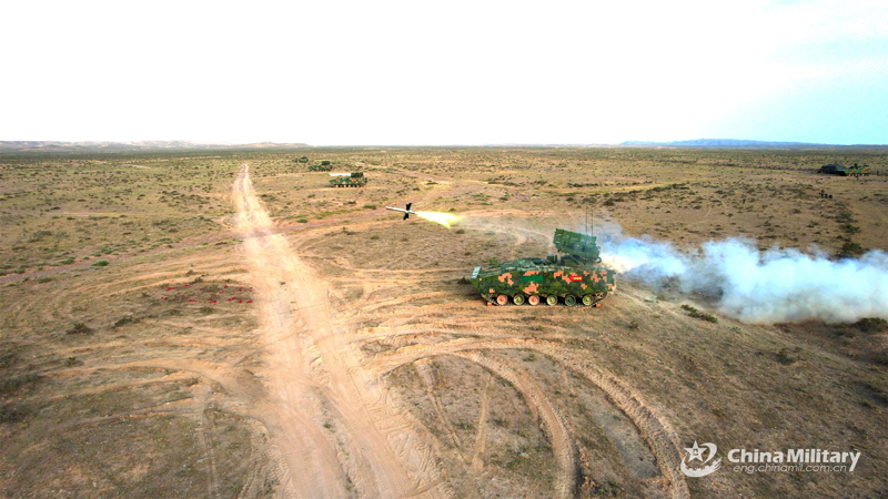 Armored vehicles attached to a combined-arms brigade under the PLA 71st Group Army fire rockets at mock targets during an attack training exercise on September 17, 2022. (eng.chinamil.com.cn/Photo by Yao Zongkai)