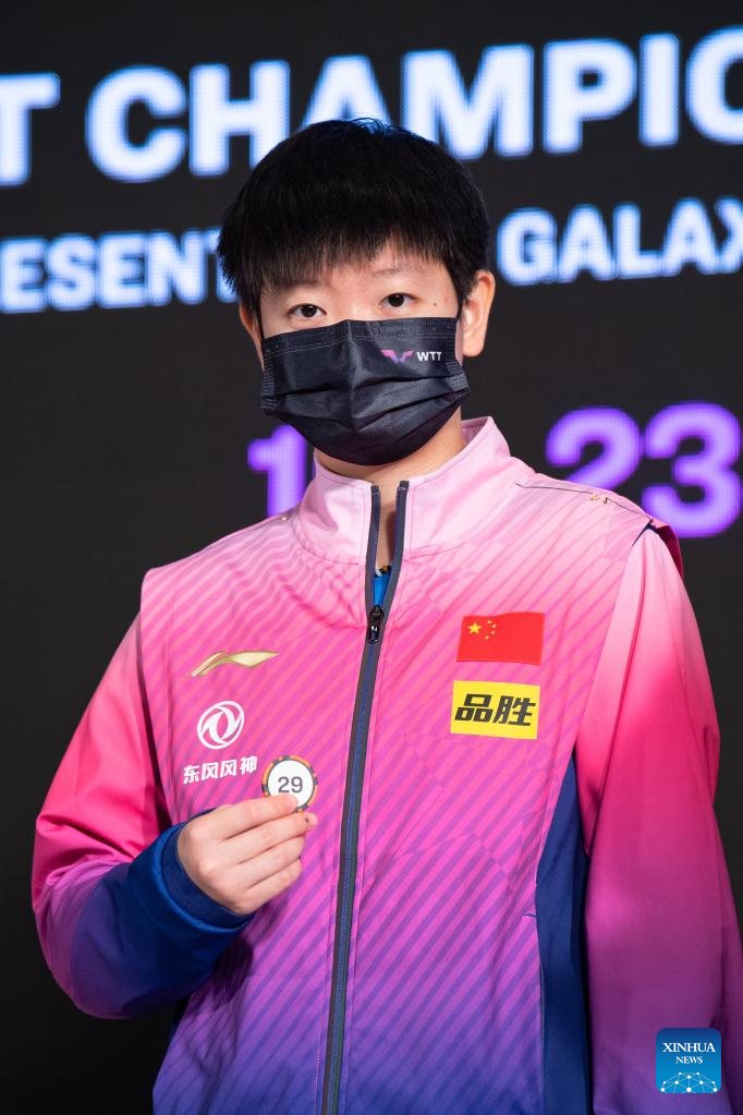 Sun Yingsha of China shows the drawing result during the drawing ceremony of WTT Champions Macao 2022 in Macao, south China, Oct. 18, 2022. (Xinhua/Cheong Kam Ka)