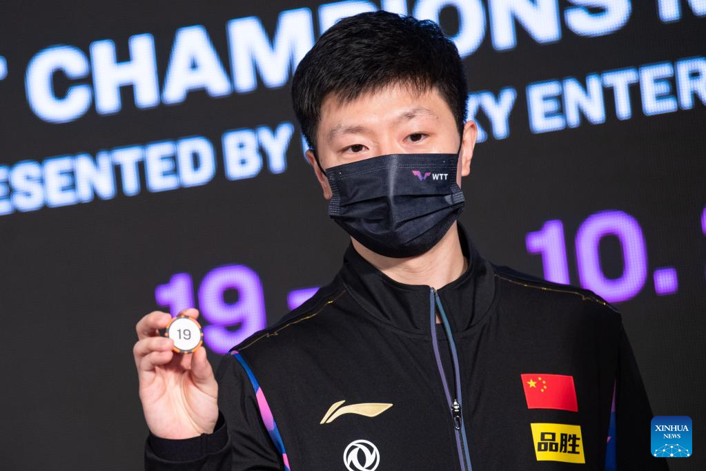 Ma Long of China shows the drawing result during the drawing ceremony of WTT Champions Macao 2022 in Macao, south China, Oct. 18, 2022. (Xinhua/Cheong Kam Ka)