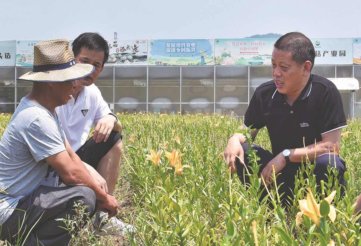 Fu Pingjun (right) discusses plant growth with villagers in Tengtou village of Ningbo, Zhejiang province, in July. CHINA DAILY