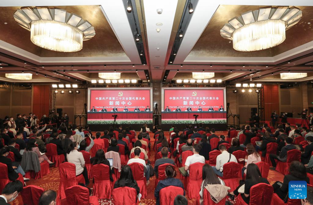 Journalists attend a press conference via video link in Beijing, capital of China, Oct. 19, 2022. The press center for the 20th National Congress of the Communist Party of China (CPC) hosted the press conference on the topic "Under the Guidance of Xi Jinping Thought on the Rule of Law, Strive to Build Higher-Standard Rule of Law in China" on Wednesday. (Xinhua/Yin Gang)