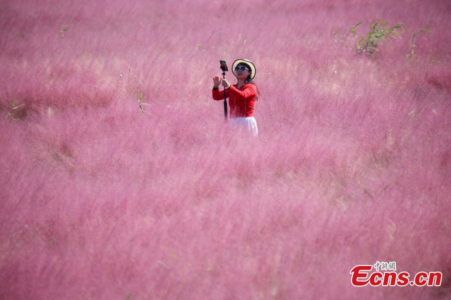 A visitor poses for photos at a field of pink muhly grass at Sanqiao wetland park in Nanjing, east China's Jiangsu Province, Oct. 18, 2022. (Photo: China News Service/Yang Bo)