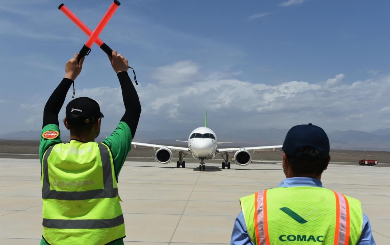 China's C919 large passenger aircraft lands at the Turpan Jiaohe Airport in Turpan, northwest China's Xinjiang Uygur autonomous region for high-temperature test flights, June 28, 2020. (People's Daily Online/Liu Jian)