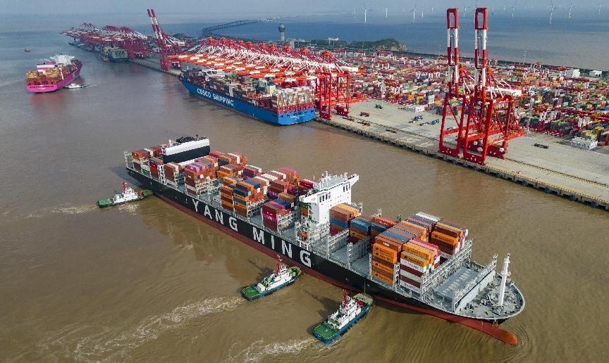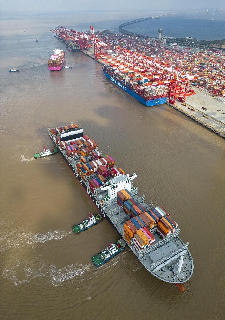 A fully loaded container vessel leaves a terminal of the Yangshan Deep-Water Port, Shanghai, Sept. 11, 2022. (People’s Daily Online/Ji Haixin)