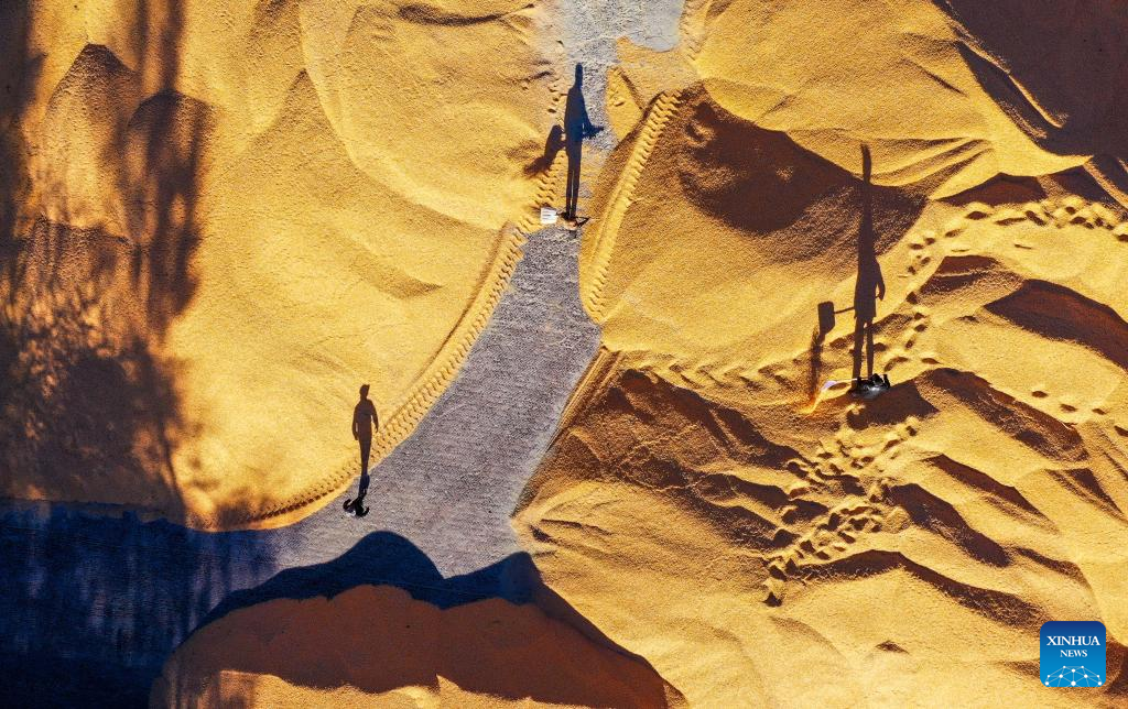 This aerial photo shows farmers drying corn in Naiman Banner of Tongliao City, north China's Inner Mongolia Autonomous Region, Oct. 18, 2022. (Xinhua/Lian Zhen)