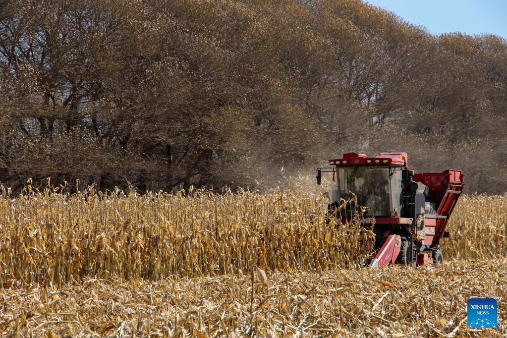 A farmer harvests corn in Naiman Banner of Tongliao City, north China's Inner Mongolia Autonomous Region, Oct. 18, 2022. (Xinhua/Lian Zhen)