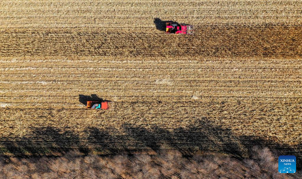 This aerial photo shows farmers harvesting corn in Naiman Banner of Tongliao City, north China's Inner Mongolia Autonomous Region, Oct. 18, 2022. (Xinhua/Lian Zhen)