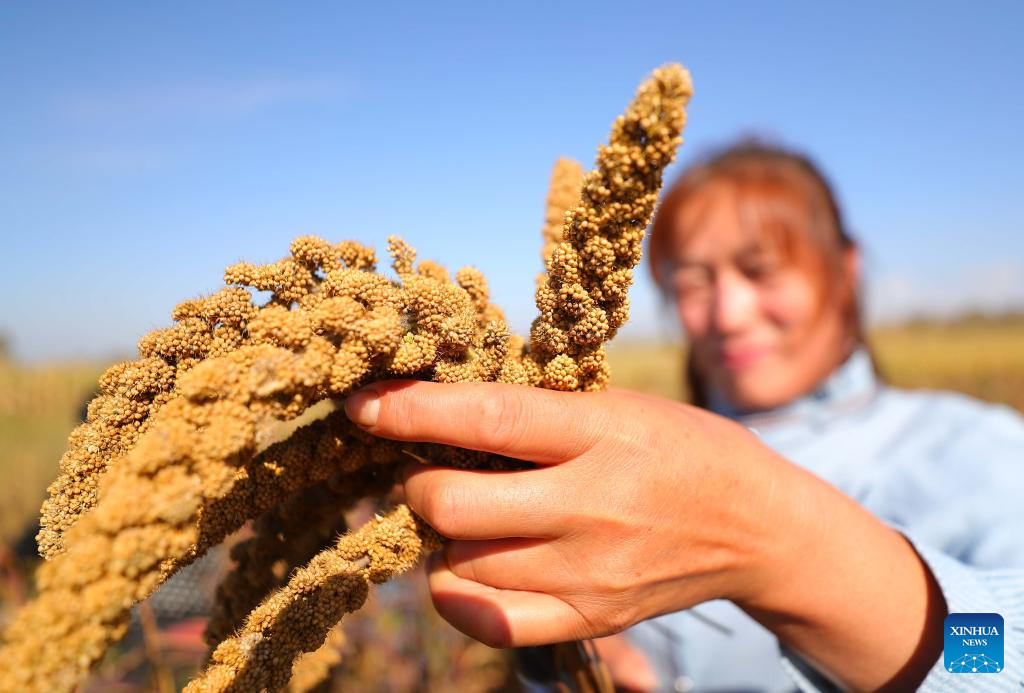 A farmer shows harvested grain in Kangping County of Shenyang, northeast China's Liaoning Province, Sept. 21, 2022. (Xinhua/Yang Qing)