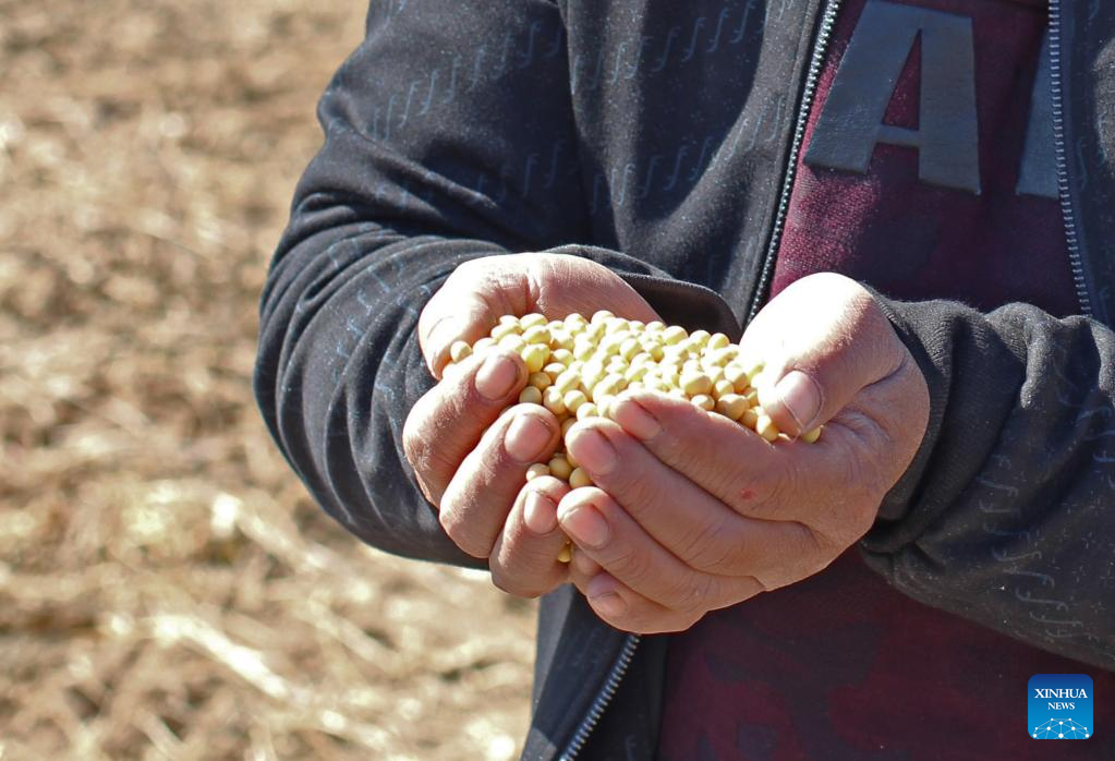 A farmer shows harvested beans in Faku County of Shenyang, northeast China's Liaoning Province, Oct. 7, 2022. (Xinhua/Yang Qing)