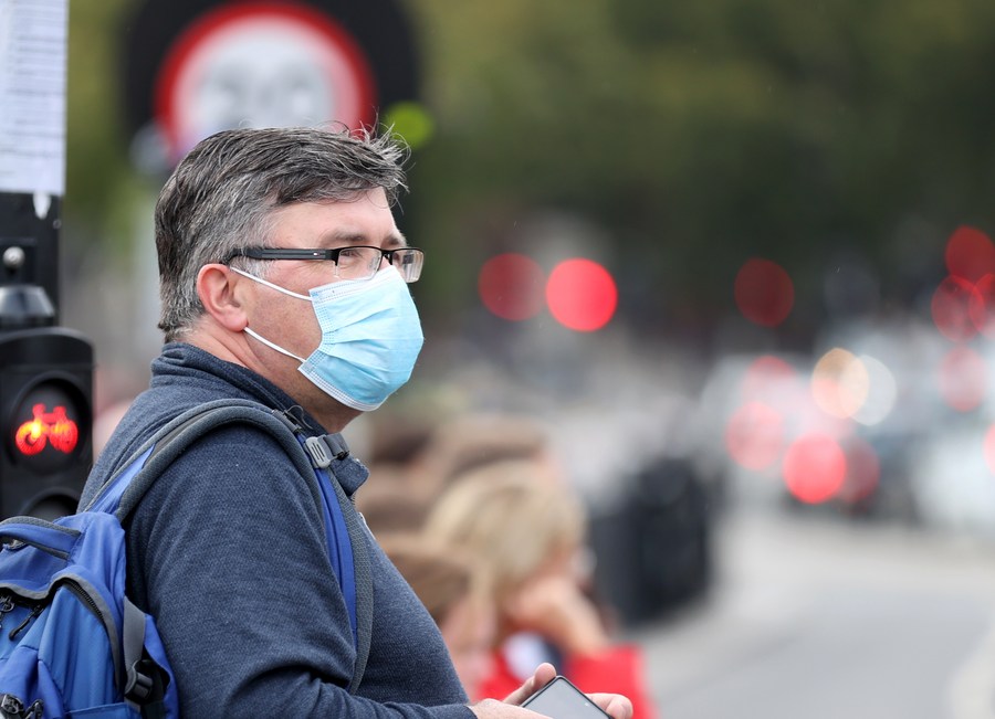 A man wearing a mask is seen near the Westminster Bridge in London, Britain, Oct. 14, 2022. (Xinhua/Li Ying)