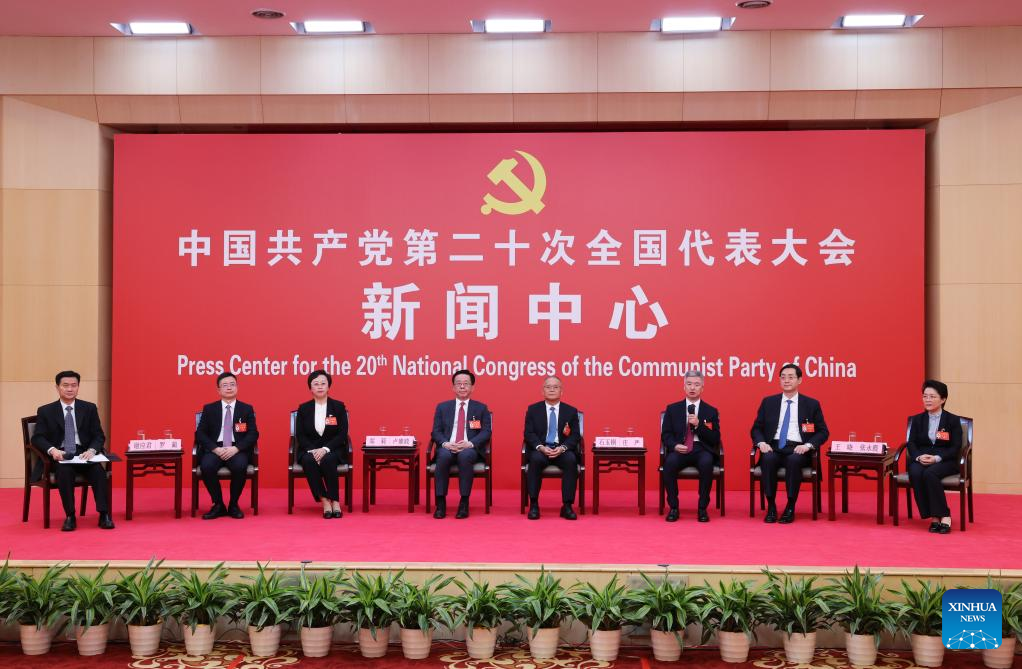 The spokespersons for delegations from Chongqing, Sichuan, Guizhou, Yunnan, Tibet, Shaanxi and Gansu to the 20th National Congress of the Communist Party of China (CPC) meet the press during a group interview in Beijing, capital of China, Oct. 19, 2022. The press center for the 20th CPC National Congress hosted its fourth group interview on Wednesday. During the interview, the spokespersons introduced the delegations' study and discussion on the report to the 20th CPC National Congress, and answered questions from journalists. (Xinhua/Zhang Yuwei)