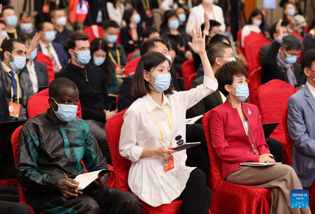 A journalist raises her hand to ask a question via video link during the fourth group interview hosted by the press center for the 20th National Congress of the Communist Party of China (CPC) in Beijing, capital of China, Oct. 19, 2022. During the interview, the spokespersons for delegations from Chongqing, Sichuan, Guizhou, Yunnan, Tibet, Shaanxi and Gansu to the 20th CPC National Congress introduced the delegations' study and discussion on the report to the 20th CPC National Congress, and answered questions from journalists. (Xinhua/Yin Gang)