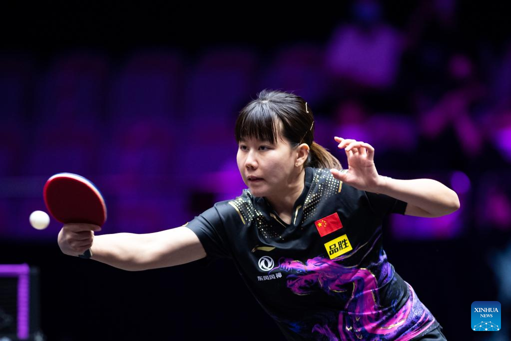 Chen Xingtong of China hits a return during the women's singles round of 32 match against Adriana Diaz of Puerto Rico at the WTT Champions Macao 2022 in Macao, south China, Oct. 19, 2022. (Xinhua/Cheong Kam Ka)
