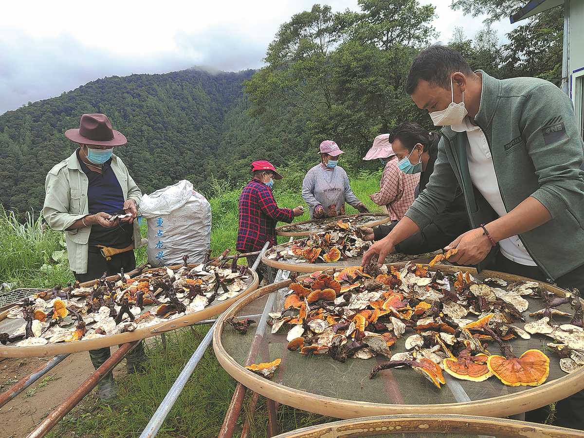 Dorje Phuntsok (left) dries lingzhi fungus (Ganoderma) together with villagers in Jeling village in Metog, Tibet autonomous region, in July. CHINA DAILY