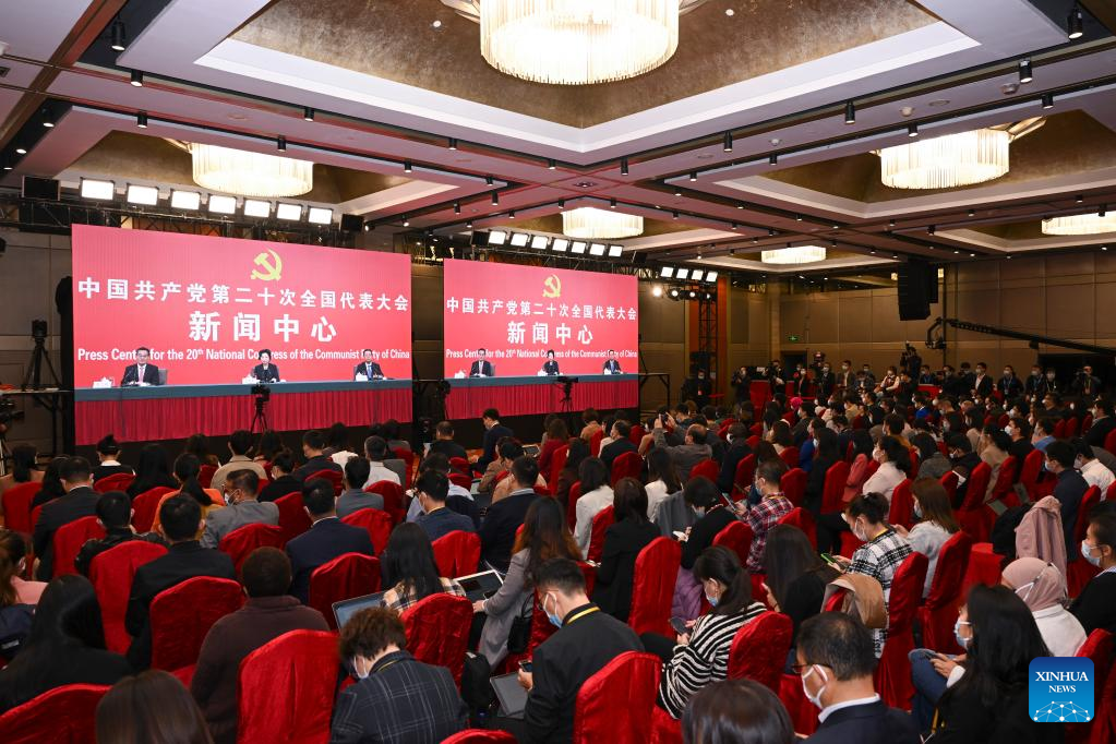 Journalists attend a press conference via video link in Beijing, capital of China, Oct. 20, 2022. The press center for the 20th National Congress of the Communist Party of China (CPC) hosted the press conference on the topic "Under the Guidance of Xi Jinping Thought on Diplomacy, Forge Ahead and Strive to Break New Ground for Major-Country Diplomacy with Chinese Characteristics" on Thursday. (Xinhua/Jin Liangkuai)