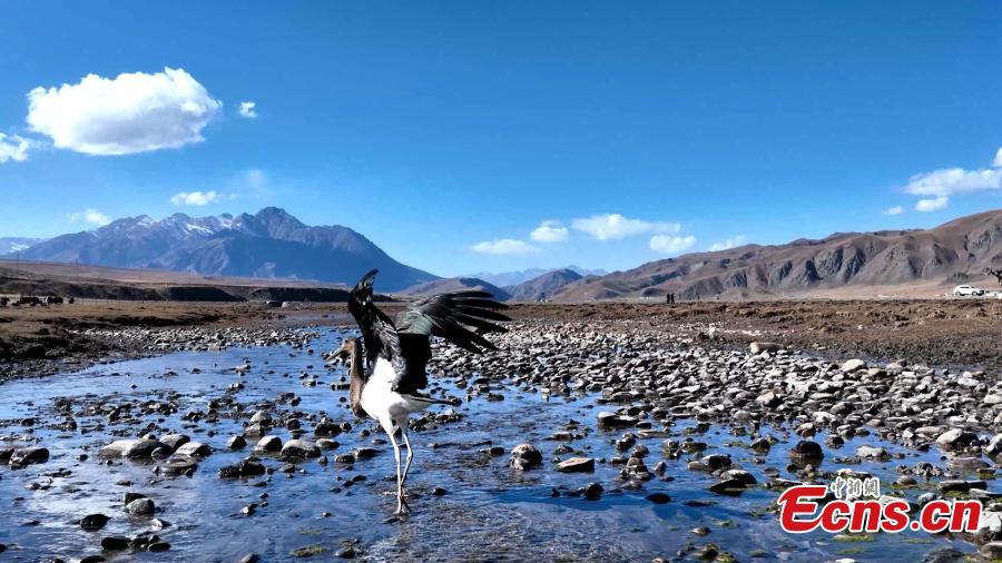 A black stork is captured resting in Qilian Mountain National Park in northwest China's Qinghai Province. (Photo: China News Service/Bao Lei)