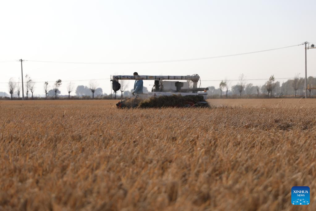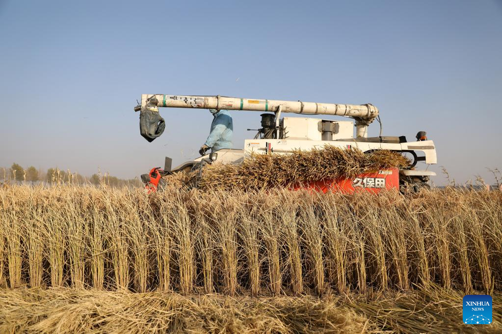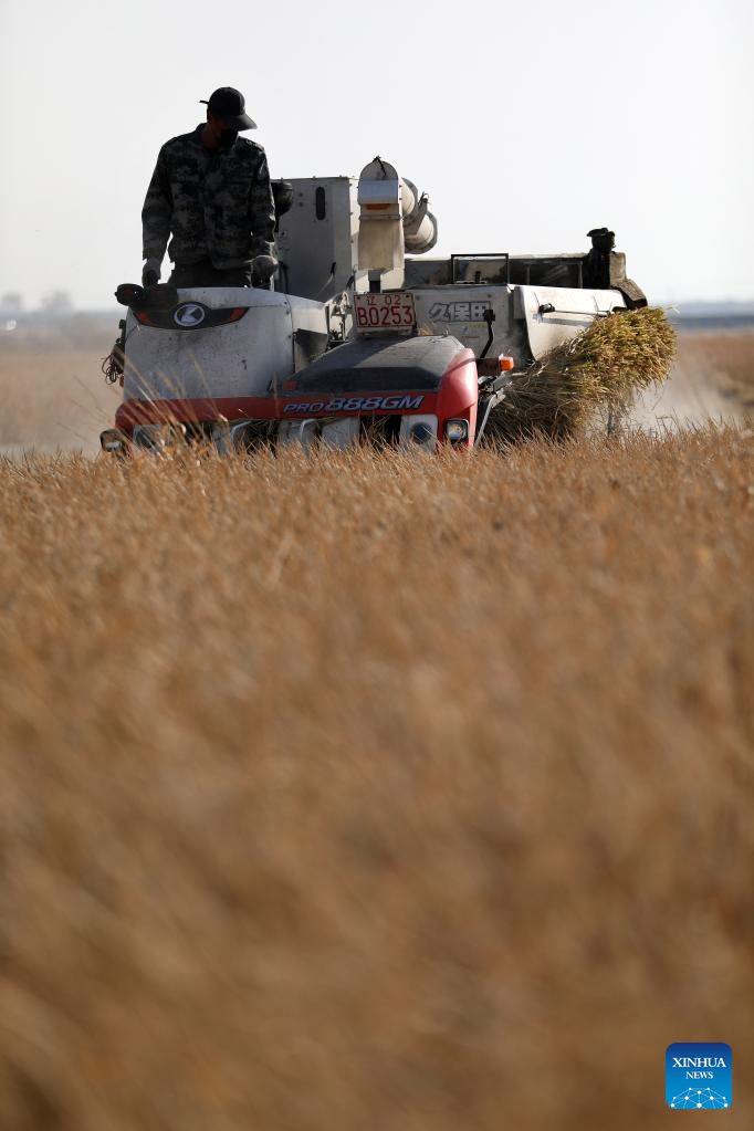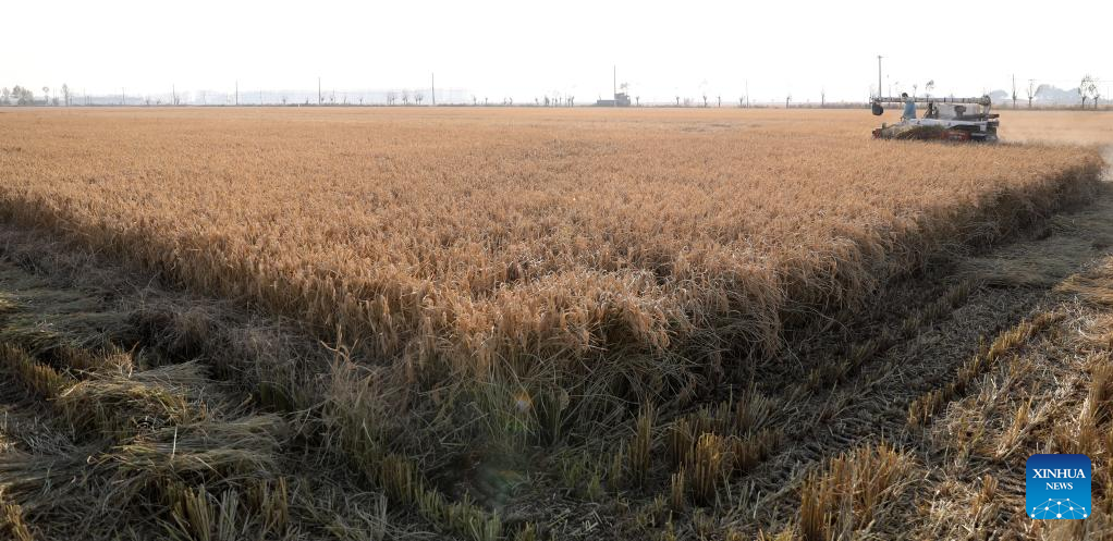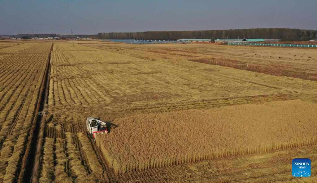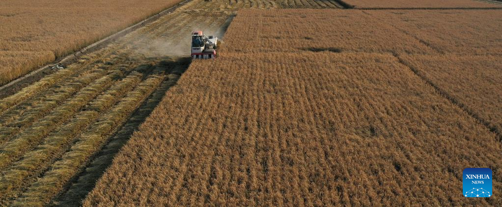 A villager riding a reaper harvests paddy rice in Beihong Village, Sujiatun District of Shenyang, northeast China's Liaoning Province, Oct. 19, 2022. (Xinhua/Yao Jianfeng)