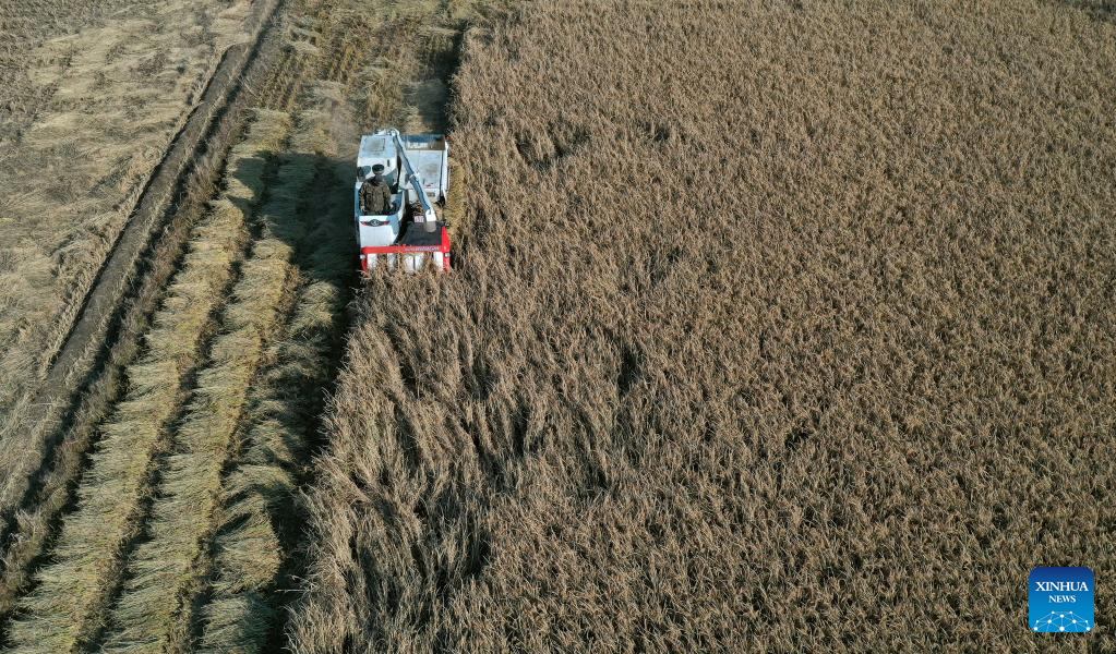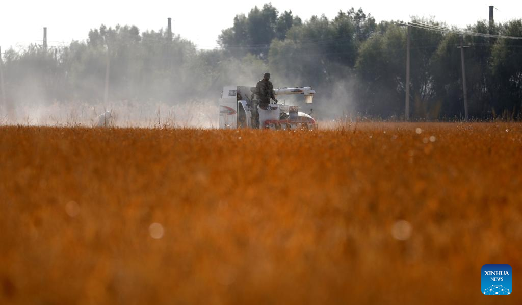 A villager riding a reaper harvests paddy rice in Shahezhan Village, Sujiatun District of Shenyang, northeast China's Liaoning Province, Oct. 19, 2022. (Xinhua/Yao Jianfeng)