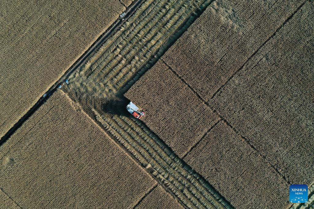 This aerial photo taken on Oct. 19, 2022 shows a reaper harvesting paddy rice in Beihong Village, Sujiatun District of Shenyang, northeast China's Liaoning Province. (Xinhua/Yao Jianfeng)