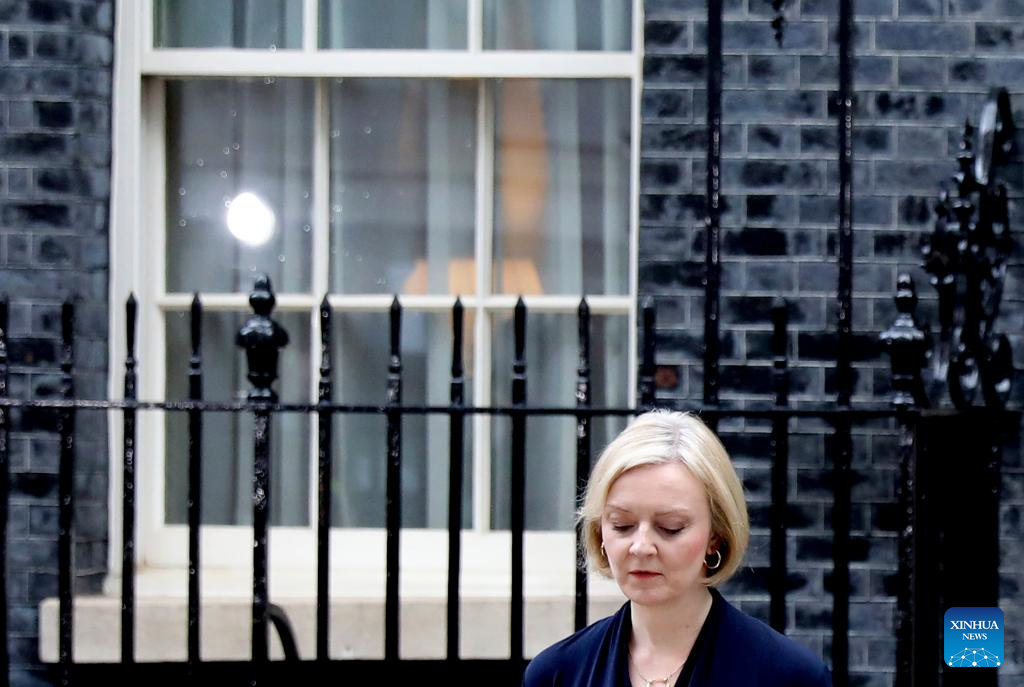 United Kingdom (UK) Prime Minister Liz Truss makes a statement outside 10 Downing Street in London, Britain, Oct. 20, 2022. (Xinhua/Li Ying)