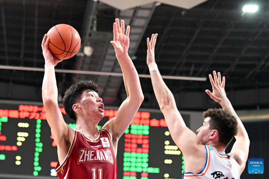 Yu Jiahao (L) of Zhejiang Golden Bulls looks to shoot during the 4th round match against Xinjiang Flying Tigers at the 2022-2023 season of the Chinese Basketball Association (CBA) league in Hangzhou, east China's Zhejiang Province, Oct. 20, 2022. (Xinhua/Chen Zhenhai)