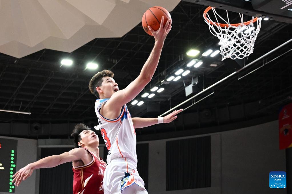 Cheng Shuaipeng (C) of Zhejiang Golden Bulls goes for a lay-up during the 4th round match against Xinjiang Flying Tigers at the 2022-2023 season of the Chinese Basketball Association (CBA) league in Hangzhou, east China's Zhejiang Province, Oct. 20, 2022. (Xinhua/Chen Zhenhai)