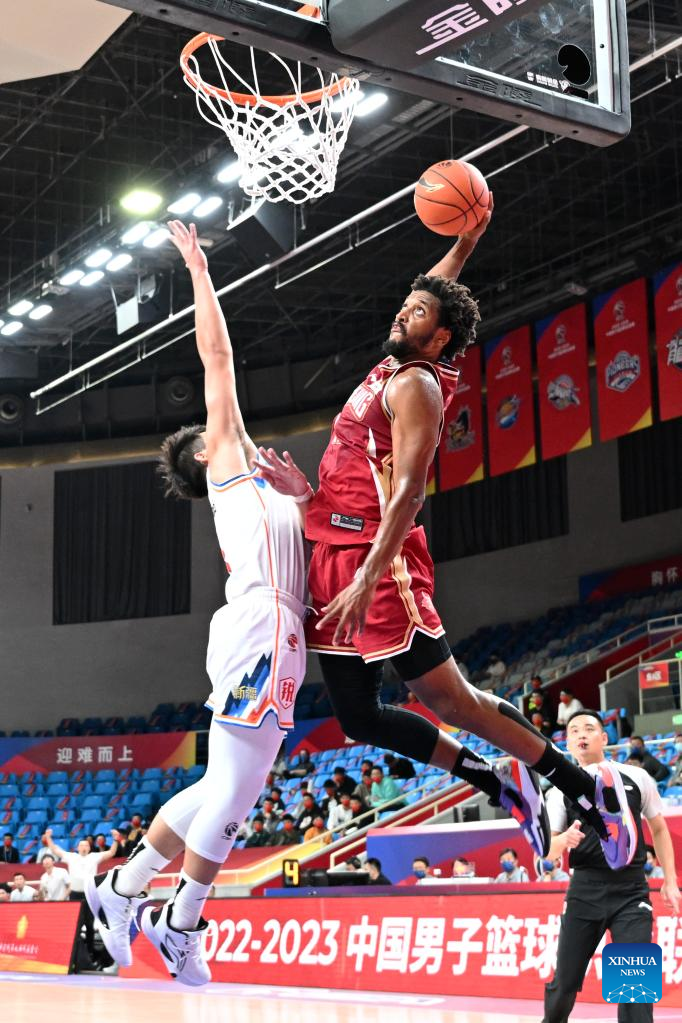 Jarmar Gulley (top R) of Zhejiang Golden Bulls goes for a dunk during the 4th round match against Xinjiang Flying Tigers at the 2022-2023 season of the Chinese Basketball Association (CBA) league in Hangzhou, east China's Zhejiang Province, Oct. 20, 2022. (Xinhua/Chen Zhenhai)