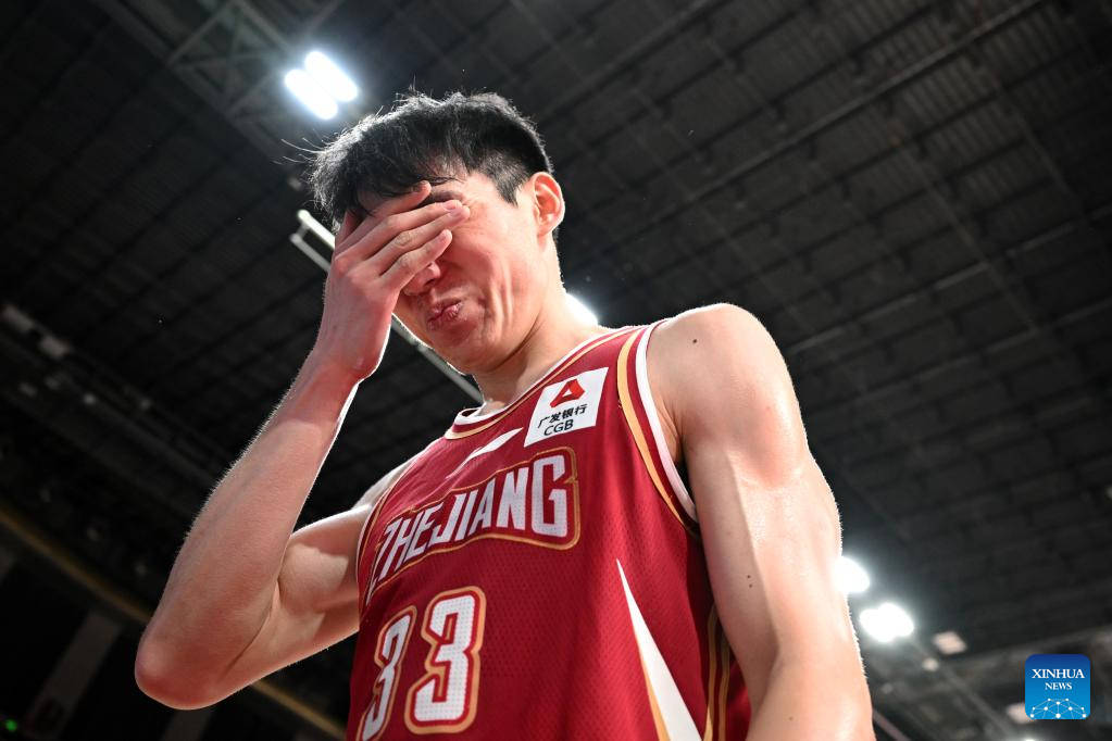 Wu Qian of Zhejiang Golden Bulls reacts during the 4th round match against Xinjiang Flying Tigers at the 2022-2023 season of the Chinese Basketball Association (CBA) league in Hangzhou, east China's Zhejiang Province, Oct. 20, 2022. (Xinhua/Chen Zhenhai)