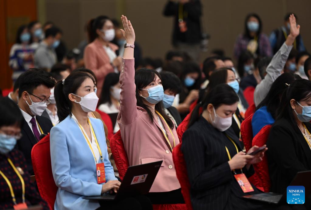 Journalists raise their hands to ask questions during a press conference via video link in Beijing, capital of China, Oct. 21, 2022. The press center for the 20th National Congress of the Communist Party of China (CPC) hosted the press conference on the topic "Building A Beautiful China Where Humanity and Nature Co-Exist in Harmony" on Friday. (Xinhua/Jin Liangkuai)