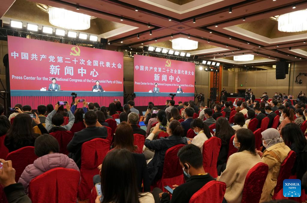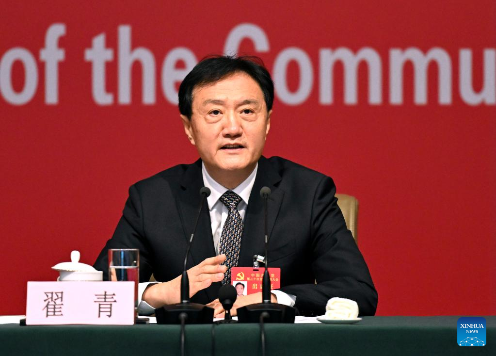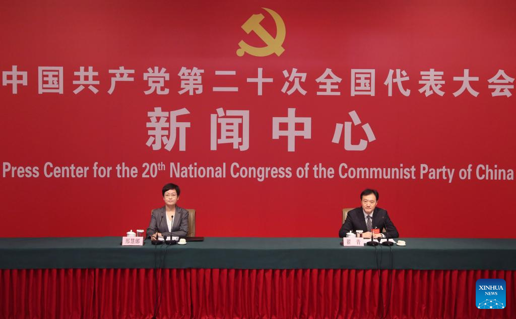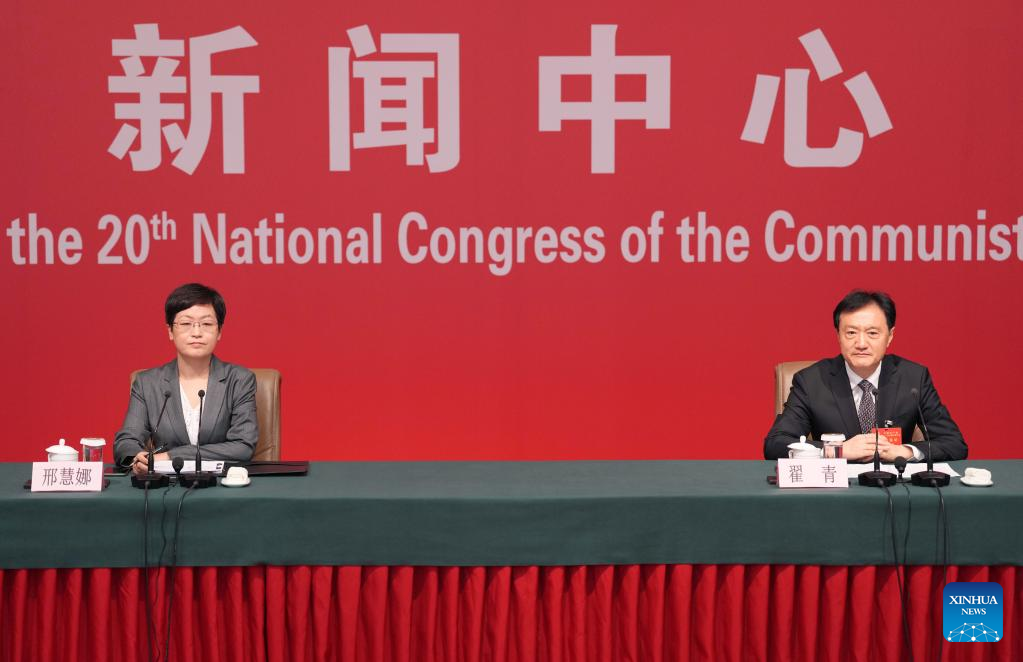 The press center for the 20th National Congress of the Communist Party of China (CPC) hosts a press conference on the topic "Building A Beautiful China Where Humanity and Nature Co-Exist in Harmony" in Beijing, capital of China, Oct. 21, 2022. Zhai Qing, vice minister of the Ministry of Ecology and Environment, attended the press conference. (Xinhua/Jia Haocheng)
