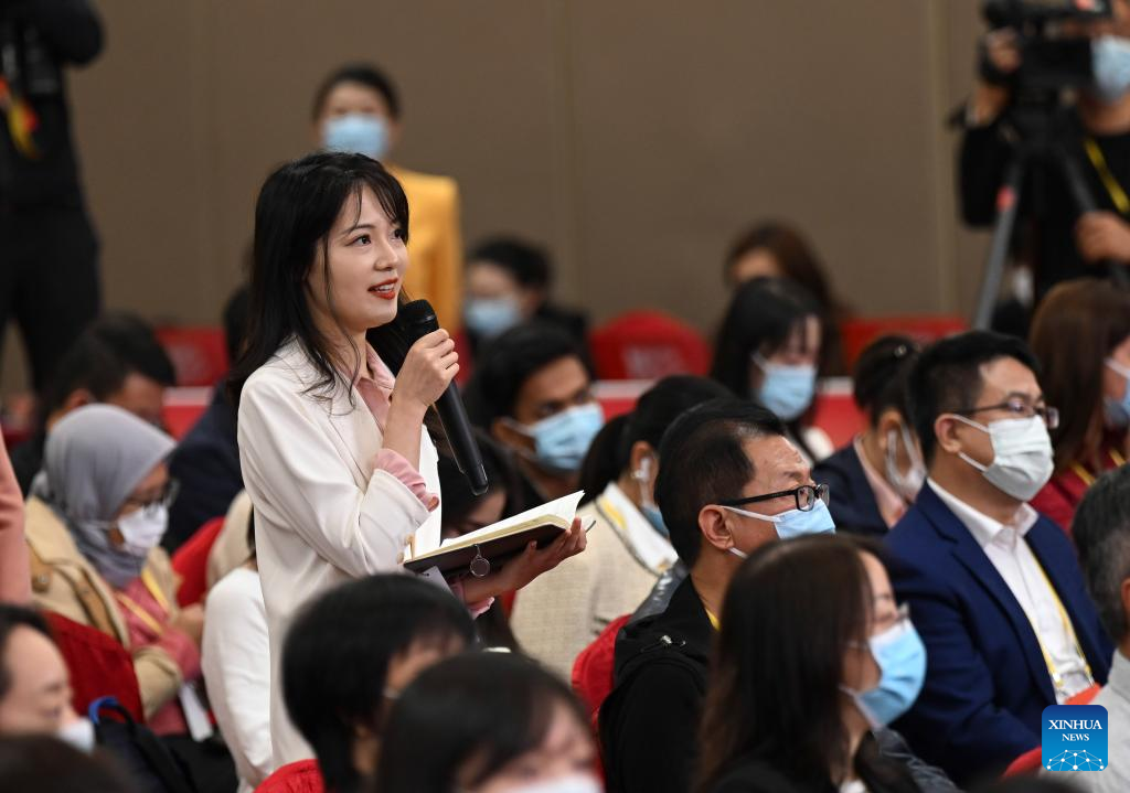 A journalist asks a question during a press conference via video link in Beijing, capital of China, Oct. 21, 2022. The press center for the 20th National Congress of the Communist Party of China (CPC) hosted the press conference on the topic "Building A Beautiful China Where Humanity and Nature Co-Exist in Harmony" on Friday. (Xinhua/Jin Liangkuai)