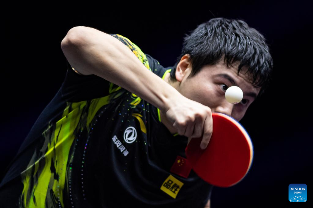 Alexis Lebrun of France hits a return during the men's singles round of 16 match against China's Liang Jingkun at the WTT Champions Macao 2022 in Macao, south China, Oct. 21, 2022. (Xinhua/Cheong Kam Ka)