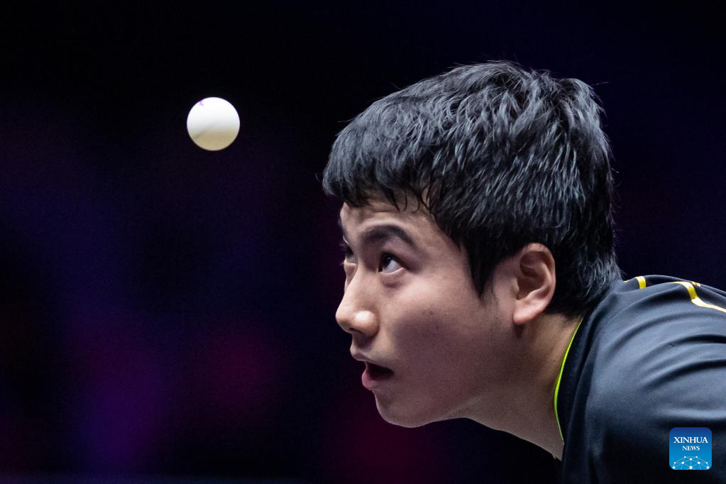China's Liang Jingkun serves during the men's singles round of 16 match against Alexis Lebrun of France at the WTT Champions Macao 2022 in Macao, south China, Oct. 21, 2022. (Xinhua/Cheong Kam Ka)