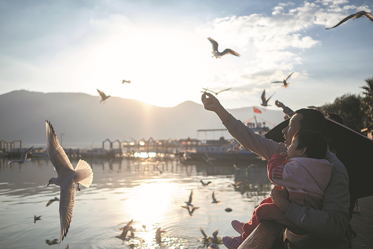 Tourists feed black-headed gulls returning for winter at Dianchi Lake in Kunming, Yunnan province, on Thursday. [Photo/Xinhua]