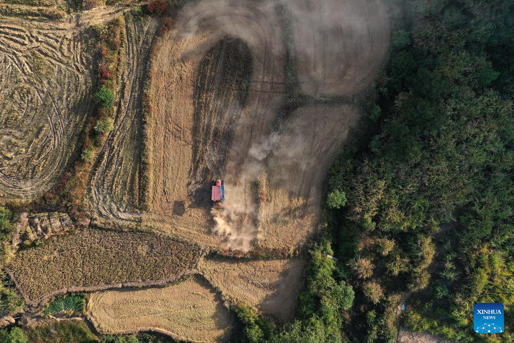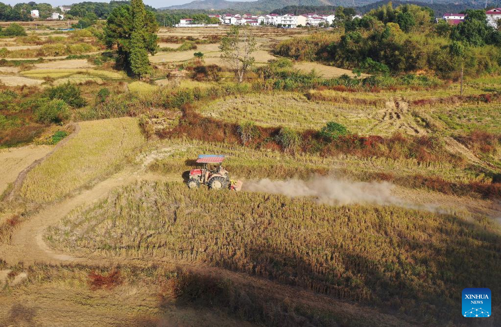 This aerial photo taken on Oct. 20, 2022 shows a farmer operating a tractor to prepare the harvested paddy fields for rapeseed sowing in Shangban Village of Luoting Township in Nanchang City, east China's Jiangxi Province. (Xinhua/Wan Xiang)
