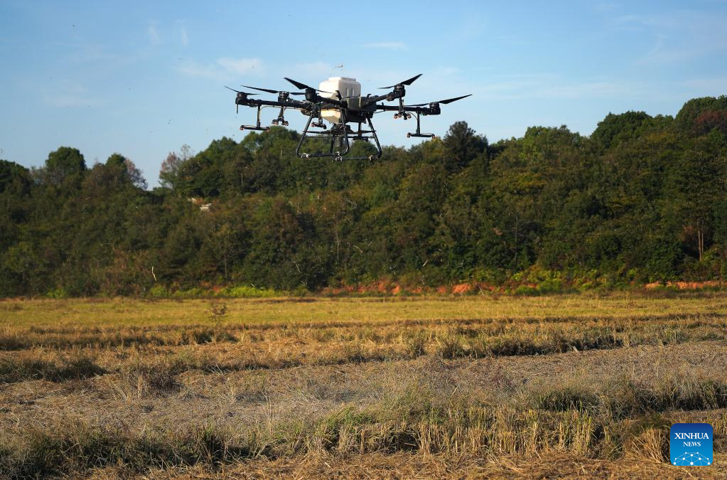 This photo taken on Oct. 20, 2022 shows a drone spreading rapeseed on harvested paddy fields in Shangban Village of Luoting Township in Nanchang City, east China's Jiangxi Province. (Xinhua/Wan Xiang)