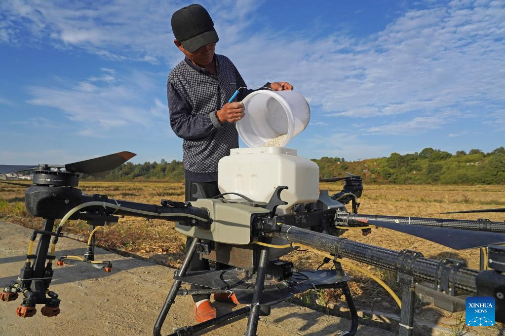 A technician operates a drone to spread rapeseed in Shangban Village of Luoting Township in Nanchang City, east China's Jiangxi Province, Oct. 20, 2022. (Xinhua/Wan Xiang)