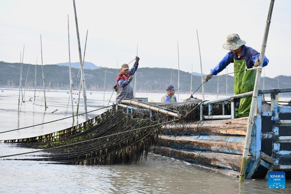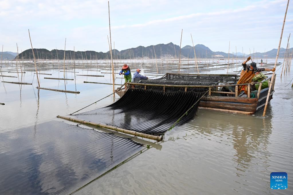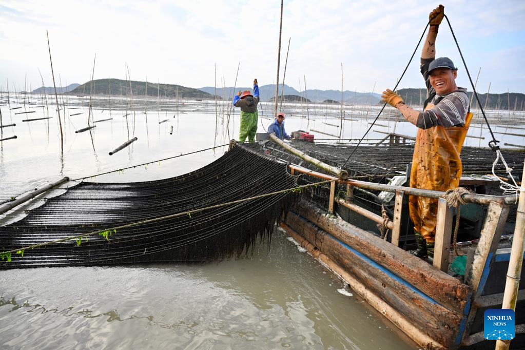 Fishers harvest laver at Shatangjie Village, Songshan Sub-district, Xiapu County of southeast China's Fujian Province, on Oct. 21, 2022. Known as zicai in Chinese, gim in Korean, and nori in Japanese, laver is an edible seaweed that plays an important part in the diets of East Asian countries. As one of the amplest source of laver products in the country, Xiapu boasts a vast area of seaborne farms for such seaweed, whose breeding, growing, and processing has become a leading cash cow for the locals. (Xinhua/Jiang Kehong)
