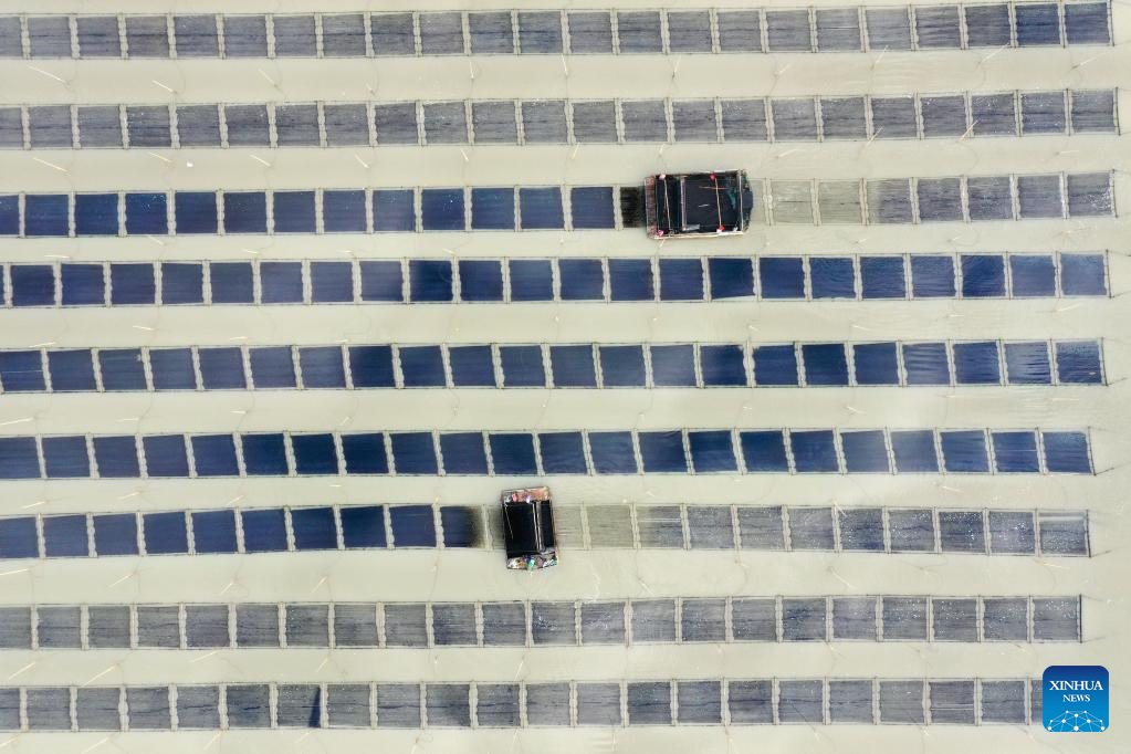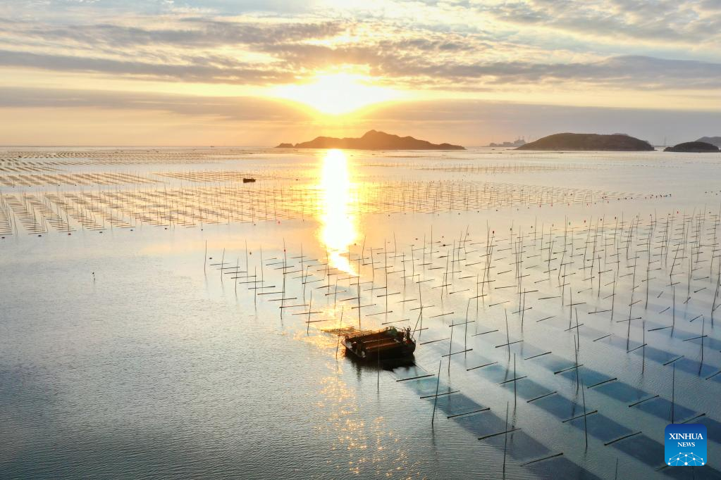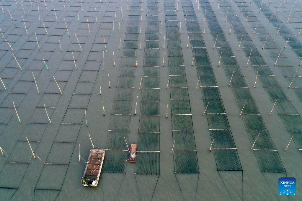 This aerial photo taken on Oct. 21, 2022 shows fishers harvesting in a seaborne laver farm at Shatangjie Village, Songshan Sub-district, Xiapu County of southeast China's Fujian Province. Known as zicai in Chinese, gim in Korean, and nori in Japanese, laver is an edible seaweed that plays an important part in the diets of East Asian countries. As one of the amplest source of laver products in the country, Xiapu boasts a vast area of seaborne farms for such seaweed, whose breeding, growing, and processing has become a leading cash cow for the locals. (Xinhua/Jiang Kehong)